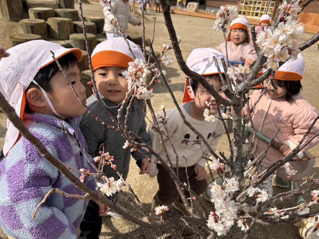 砂場や三輪車、園庭での体を動かした遊びが大好きな子ども達。今日一番の夢中な出来事は、【あっ、お花が咲いてるよ🌸】と暖かい日差しで咲き始めた花でした。そっと近づいて、【くん・くん・くん】と匂いをかいでみたり可愛さにうっとりしたりと、春が来るのが待ち遠しい子ども達でした。