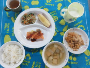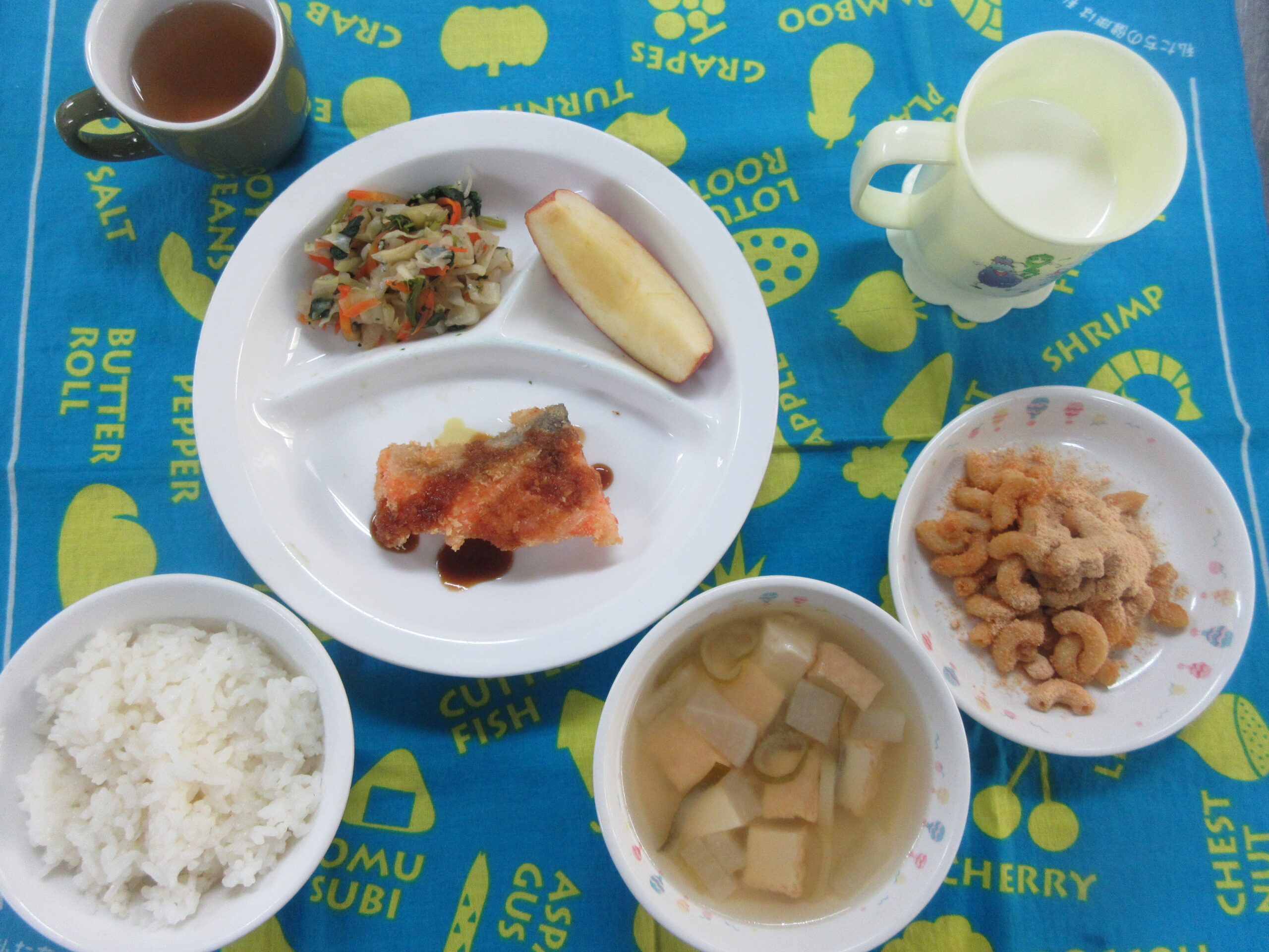 3月27日(金) 給食・おやつ献立 公開済み: 2026年3月27日更新: 2026年4月4日作成者: hayamanookaカテゴリー: 端山の丘こども園給食 <給食> 御飯 みそ汁(だいこん・厚揚げ) 鮭のフライ キャベツとじゃこの酢和え りんご <おやつ> 牛乳 マカロニきなこ 関連記事 4月8日の給食 ご飯 クラムチャウダー(豆乳) 豚肉の香味焼き(もやし入り) きゅうりのゆかり和え 桃缶 公開済み: 2021年4月8日更新: 2021年4月8日作成者: hayamanookaカテゴリー: 端山の丘こども園給食 7月3日 給食 豚丼 すまし汁 オレンジ 公開済み: 2021年7月5日更新: 2021年7月5日作成者: hayamanookaカテゴリー: 端山の丘こども園給食 2月5日(水) 給食・おやつ献立 <給食> 御飯 わかめスープ(もやし) 厚揚げのケチャップ煮 ブロッコリーのおかか和え バナナ <おやつ> 牛乳 大根めしおにぎり 公開済み: 2025年2月5日更新: 2025年2月7日作成者: hayamanookaカテゴリー: 端山の丘こども園給食