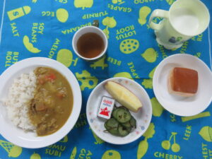 4月1日(水) 給食・おやつ献立 公開済み: 2026年4月1日更新: 2026年4月4日作成者: hayamanookaカテゴリー: 端山の丘こども園給食 <給食> カレーライス きゅうりの昆布和え りんご ベビーチーズ <おやつ> 牛乳 練乳いちごパン 今年度も子ども達にとって楽しみな給食の時間となるよう、給食室一同安全でおいしい給食作りをしていきたいと思いますので御協力よろしくお願いいたします 関連記事 9月17日(火)おやつ献立 <おやつ> みかんゼリー 公開済み: 2024年9月17日更新: 2024年9月17日作成者: hayamanookaカテゴリー: 端山の丘こども園給食 9月16日(金) 給食・おやつ献立 〈給食〉 ・ハリハリわかめごはん ・豆乳汁(さつまいも・野菜) ・豚肉と昆布の炒め煮 ・いんげんのツナごま和え ・りんご 〈おやつ〉 ・牛乳 ・揚げパン(きなこ) 公開済み: 2022年9月16日更新: 2022年10月18日作成者: hayamanookaカテゴリー: 端山の丘こども園給食 10月17日(月) 給食・おやつ献立 ・さつまいもごはん ・けんちん汁 ・さんまの煮つけ ・キャベツとほうれん草の塩ごま和え ・りんご 〈おやつ〉 ・牛乳 ・かぼちゃの豆腐パン 公開済み: 2022年10月17日更新: 2022年10月17日作成者: hayamanookaカテゴリー: 端山の丘こども園給食