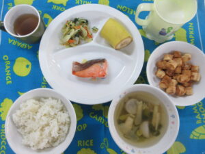 4月3日(金) 給食・おやつ献立 公開済み: 2026年4月3日更新: 2026年4月4日作成者: hayamanookaカテゴリー: 端山の丘こども園給食 <給食> 御飯 すまし汁(だいこん・あげ) さけの塩こうじ焼き ほうれん草のごま和え(人参) バナナ <おやつ> 牛乳 お麩ラスク 関連記事 3月14日 給食 ドライカレーライス わかめスープ(じゃがいも) なばなのしらす和え 公開済み: 2022年3月16日更新: 2022年3月16日作成者: hayamanookaカテゴリー: 端山の丘こども園給食 11月17日 おやつ プリン 公開済み: 2021年11月18日更新: 2021年11月18日作成者: hayamanookaカテゴリー: 端山の丘こども園給食 11月4日 給食 菜飯(小松菜、コーン) みそ汁(玉ねぎ、なす) さばの焼きおろし煮 かぼちゃ(蒸し) 公開済み: 2021年11月4日更新: 2021年11月4日作成者: hayamanookaカテゴリー: 端山の丘こども園給食