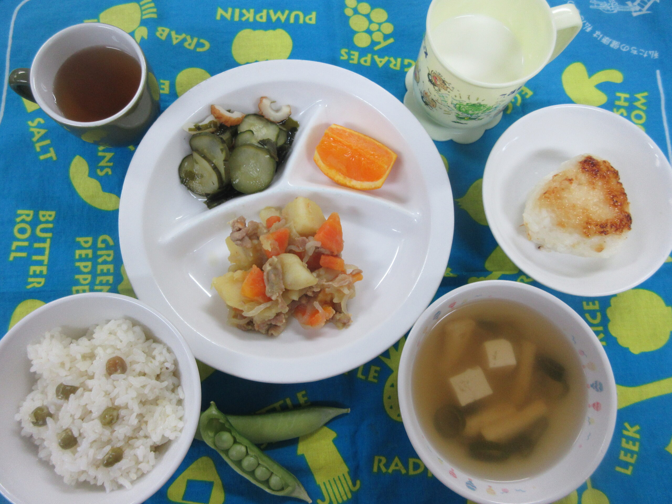 4月7日(火) 給食・おやつ献立 公開済み: 2026年4月7日更新: 2026年4月24日作成者: hayamanookaカテゴリー: 端山の丘こども園給食 <給食> 豆御飯 すまし汁(もやし・あげ) 肉じゃが・カレー味 きゅうりの酢の物 オレンジ 今日は4月の旬の「えんどう豆」を使って豆御飯を作りました! <おやつ> 牛乳 五平餅 関連記事 3月25日 給食 ごはん クラムチャウダー 鶏肉のマーマレード焼き コールスローサラダ りんご 公開済み: 2022年3月28日更新: 2022年3月28日作成者: hayamanookaカテゴリー: 端山の丘こども園給食 9月12日(月) 給食・おやつ献立 ・ごはん ・わかめとキャベツのスープ ・マーボーなす ・ゆでいんげん ・フルーツカクテル(キウイ・モモ) 〈おやつ〉 ・牛乳 ・にんじんポンデケージョ 公開済み: 2022年9月12日更新: 2022年10月18日作成者: hayamanookaカテゴリー: 端山の丘こども園給食 12月27日(水) 給食・おやつ献立 〈給食〉 ・ごはん ・みそ汁(切り干し大根・わかめ) ・豚肉と野菜のごま炒め ・粉ふき芋 ・りんご 〈おやつ〉 ・牛乳 ・マカロニきな粉 公開済み: 2023年12月27日更新: 2024年1月5日作成者: hayamanookaカテゴリー: 端山の丘こども園給食