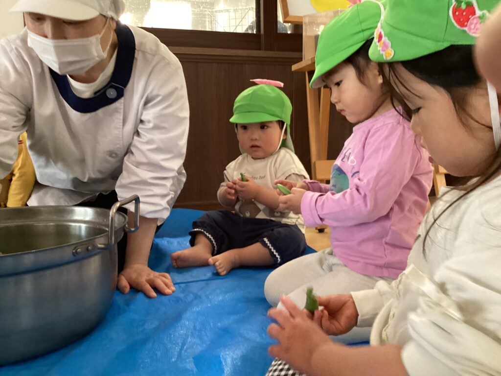 スナップエンドウに触れた子どもたち。おやつで食べてみると「甘くておいしい!」と喜んでいました☺
