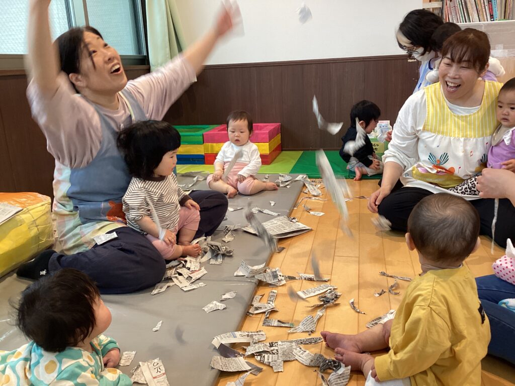 手や指先を使って、新聞紙をたくさんちぎって遊びました♪新聞紙の雨に大喜び☺