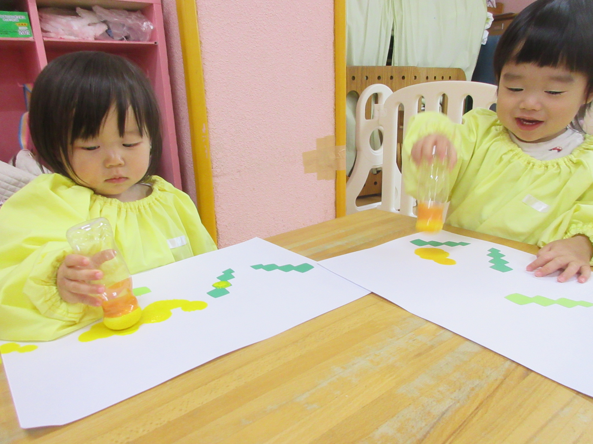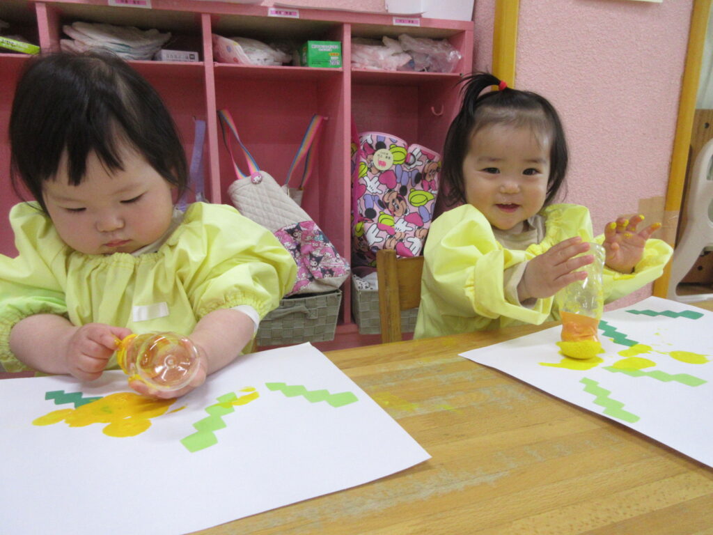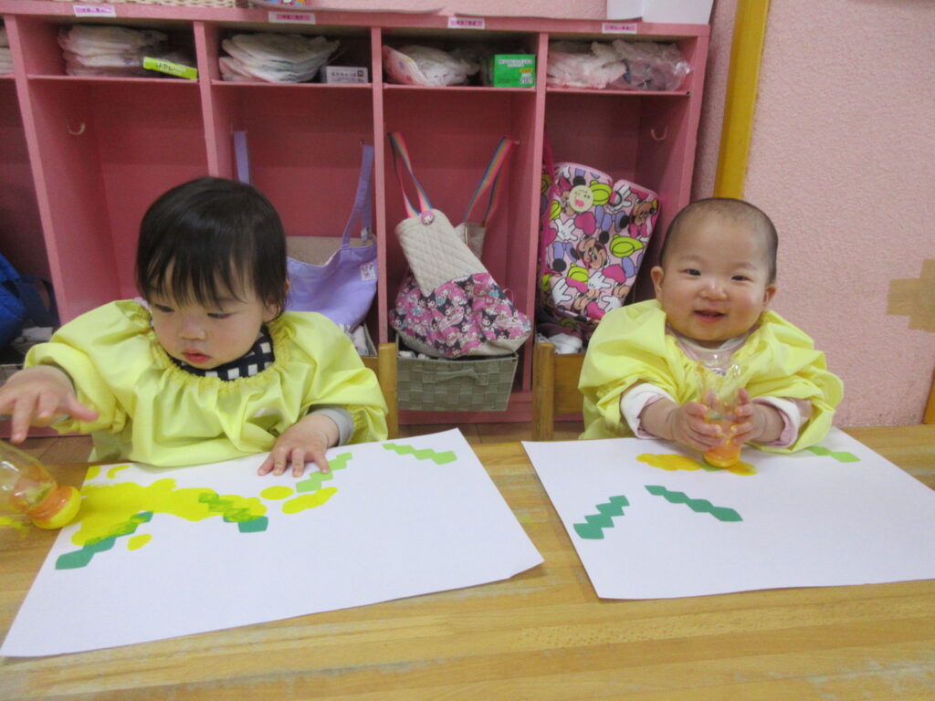 楽しくぽんぽん♪(うさぎ0歳児、1歳児) 公開済み: 2026年4月30日更新: 2026年4月30日作成者: hayamanookaカテゴリー: 端山の丘こども園ブログ 絵の具をぽんぽん!紙に色が付くと、とっても嬉しそう。タンポでトントンして、綺麗なたんぽぽが出来ました。 関連記事 あああ 割れる~(さくら、4歳児) スイカ割りを楽しみました。年長組が代表でスイカを割り、みんなで「もっと前ー」「違う違う」と言い、大盛り上がりでした。割ったスイカはフルーツポンチにしておいしく食べました。 公開済み: 2025年9月3日更新: 2025年9月3日作成者: hayamanookaカテゴリー: 端山の丘こども園ブログ 気分はお兄さんお姉さん💕(うさぎ0歳児、1歳児) 園庭で元気一杯遊びました。一歳児はランリュックを背負って行き、乗り物や砂場遊びなど大好きな遊びを楽しんでいました。 公開済み: 2026年2月27日更新: 2026年2月27日作成者: hayamanookaカテゴリー: 端山の丘こども園ブログ 大きなブドウだー!(うさぎ0歳児、1歳児) ブドウ狩りをしました!自分で作ったブドウを手にして、大喜びのみんなです! 公開済み: 2022年11月16日更新: 2022年11月16日作成者: hayamanookaカテゴリー: 端山の丘こども園ブログ
