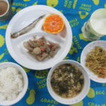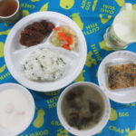 <給食> わかめ御飯 みそ汁(なす・あげ) レバーの胡麻ソースからめ キャベツの和え物 ヨーグルト(オレンジ) <おやつ> 牛乳 チヂミ(小松菜・豆腐・ごま)