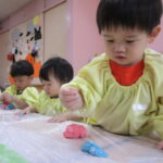 みんなが大好きな小麦粉粘土遊びをしました。何度も経験している子や、初めての0歳児さんもいたので、粉の感触や、食紅を入れて色がつく様子など、一つずつの工程を楽しみました。
