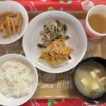 【給食】 ごはん みそ汁 白身魚のちゃんちゃん焼き もやしとわかめ酢の物 【おやつ】 マカロニきな粉