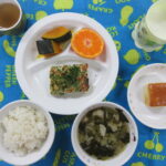 <給食> 御飯 すまし汁(こなつな・はくさい) 松風焼き・豆腐いり(ごま) かぼちゃの甘煮 みかん <おやつ> 牛乳 北海道ミルクパン 都合により、メニューを変更しています。