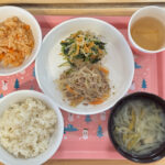 【給食】 ごはん 野菜スープ 春雨のチャプチェ風 ほうれん草のナムル 【おやつ】 ケチャップライス