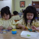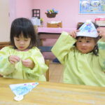 サンタのお面作りをしました。お花紙をビリビリ破ったり、貼ったりしながらおひげをつくり、帽子には好きな色のクレパスで色付けを楽しみました。