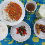 <給食> カレー風味のトマトライス きゅうりのピクルス ヨーグルト(りんご) <おやつ> 牛乳 大学芋