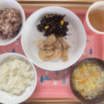 【給食】 ごはん 野菜スープ 鶏肉のカレー焼き ひじきのソテー 【おやつ】 あずきおこわ