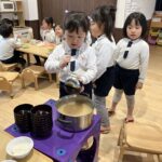 自分たちで配膳を行っています。【そーっと慎重に・こぼさないように】と丁寧にお汁を入れています。 みんなのご飯はそろったかな? では一緒に「いただきます☆」