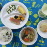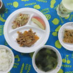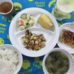 <給食> 御飯 みそ汁(チンゲン菜・わかめ) 炒り豆腐(ちくわひじき) ポテトサラダ(コーン) バナナ <おやつ> 牛乳 米粉お好み焼き(大豆粉)