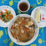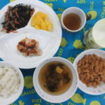 <給食> 御飯 豆腐すまし汁(キャベツ・えのき) 鶏むね肉のふっくら焼き ひじきの煮物 パイン缶 <おやつ> 牛乳 マカロニきなこ
