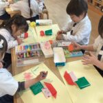 季節の折り紙を折りました。選んだ色で何が折れるでしょうか。 みんなは会ったことがあるのかな?獅子舞の出来上がりです☆