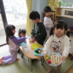 進級し、新しいお部屋の玩具に興味を持って遊んでいます。初めての玩具に自分から関わり、楽しみながら遊びを拡げていますよ!