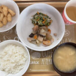 【給食】 ごはん みそ汁 ミートボール ポパイソテー 【おやつ】 ゆかりおにぎり