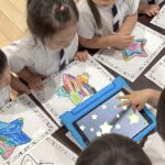 自分の塗り絵が浮かび上がるマジカルレンズをしています☆ 絵をタップするとキラキラと音も鳴るよ!