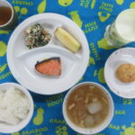 <給食> 御飯 大根とあげの煮物風汁 さけの塩こうじ焼き 白和え(ほうれん草・にんじん・ごま) みかん <給食> 牛乳 おからスコーン