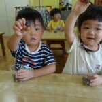 園外保育で太陽が丘に行った時に、大きなドングリをたくさん拾って来ました。そのドングリを可愛くトトロにしてマラカスにしました。シャカシャカ動くトトロに大喜びの子ども達です。