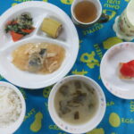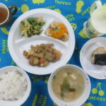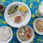<給食> 御飯 みそ汁(厚揚げ・だいこん) 肉じゃが・カレー味(豚肉) なばなのごま和え(キャベツ) フルーツカクテル(キウイ) <おやつ> 牛乳 おにぎり(じゃこおかか)