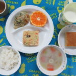 <給食> 御飯 ちゃんぽん汁 豆腐の五目焼き きゅうりの中華風サラダ みかん <おやつ> 牛乳 米粉のバナナケーキ
