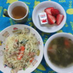 <給食> 焼きビーフン(カレー) かぶのスープ いちご ベビーチーズ